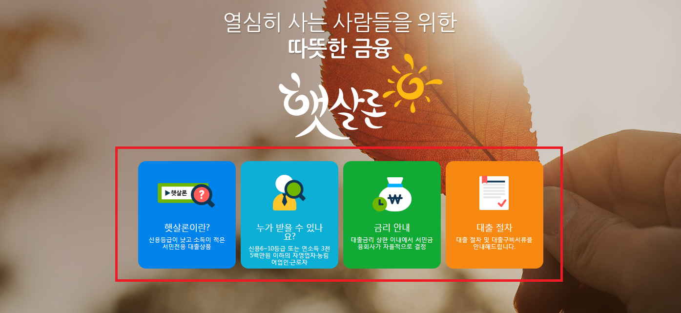 ⊙기본요건: 햇살론 신청자격을 만족하는 근로자, 자영업자, 농림어업인.(성실상환자 제외)