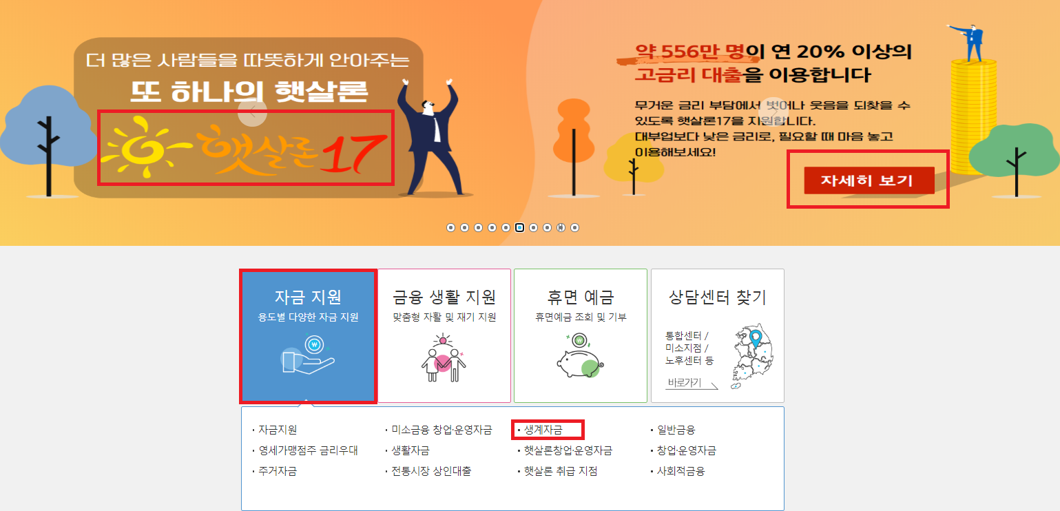 서민금융진흥원 서비스 사이트 자금지원 항목에서