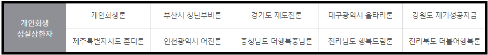 신용회복위원회 개인회생론의 경우 각 지역별 신용회복지부를 통해 여러가지 이름으로 제공되고 있습니다. 이는 부산시의 청년부비론, 경기도 재도전론, 대구광역시 울타리론, 강원도 재기성공자금, 제주 혼디론, 인천 어진론, 충청남도 더행복충남론, 전라남도 행복드림론, 전라북도 더불어행복론 등이 있습니다.