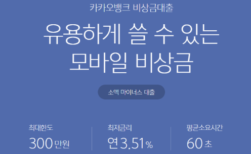 우리나라 사람들이 가장 많이 이용하는 소액대출이 바로 카카오 뱅크 비상금 대출입니다. 다른 상품에 비하면 대출 금리도 낮은 편이라서 인기가 많은 상품입니다. 저도 비상금이 급하게 필요할 때 카카오 뱅크를 이용했는데 메뉴가 보기에 편리했습니다.