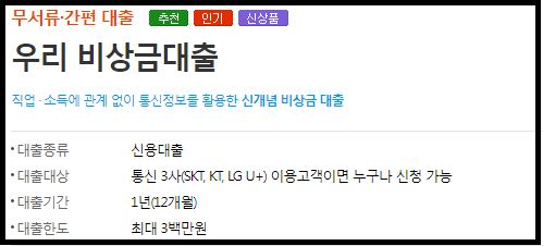 특이한 것은 다른 대출과 달리 신용등급으로만 평가하는 것이 아니라 통신 등급도 고려된다고 합니다. 그래서 많은 사람들이 쉽게 비상금대출로 사용하고 있는 것 같습니다.